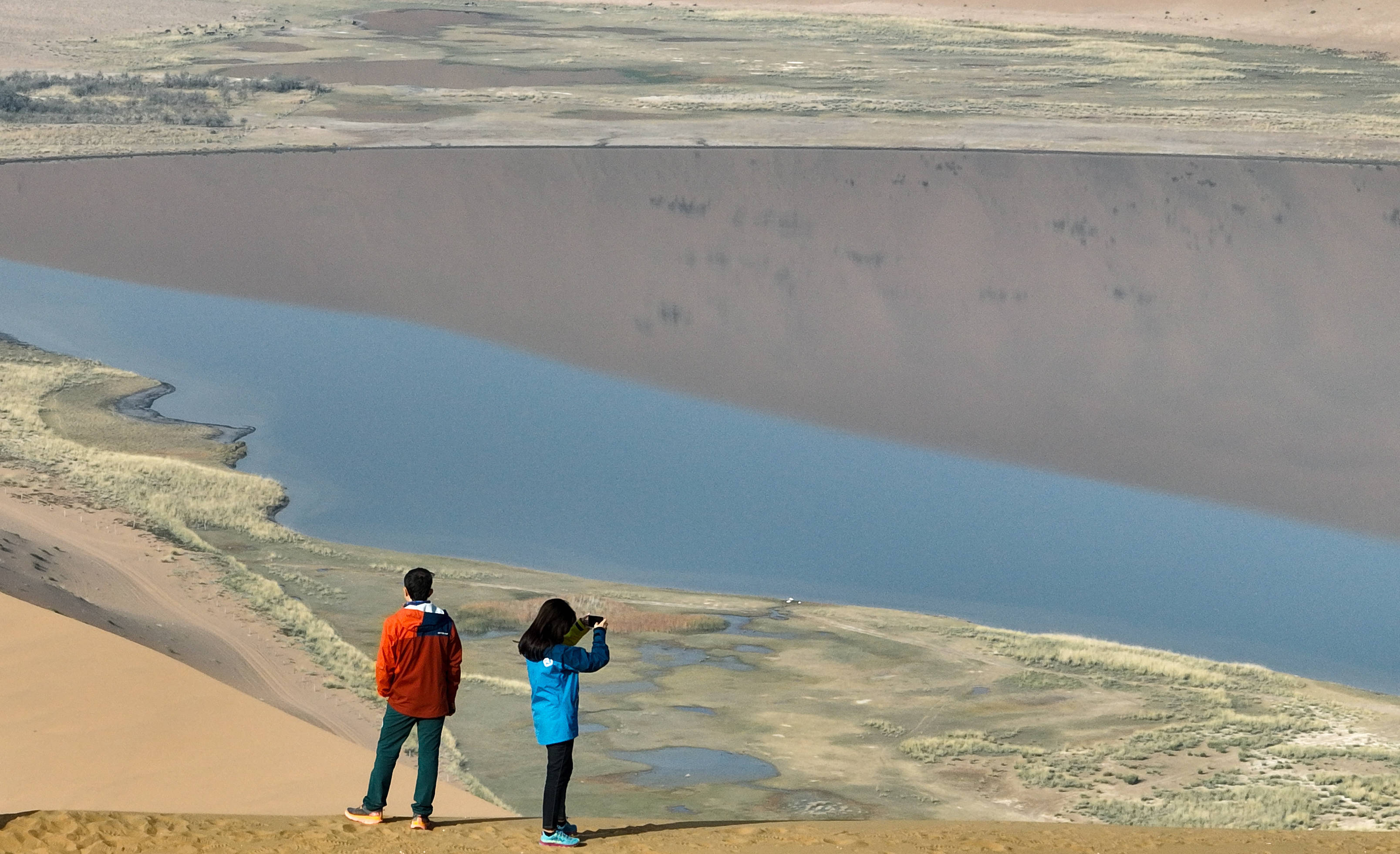 游客在巴丹吉林沙漠拍照游玩(无人机照片)。新华社记者 贝赫 摄阿拉善巴丹吉林沙漠世界自然遗产保护中心工作人员刘维斌从事沙漠巡护工作已有20多年,如今他和同事每周都要进入巴丹吉林沙漠巡护。核查目标点位、观察植物生长量、监测记录湖泊水位……一系列看似简单的巡护工作,放在近5万平方公里的沙漠中进行,困难程度可想而知。